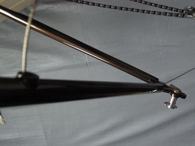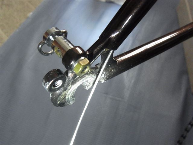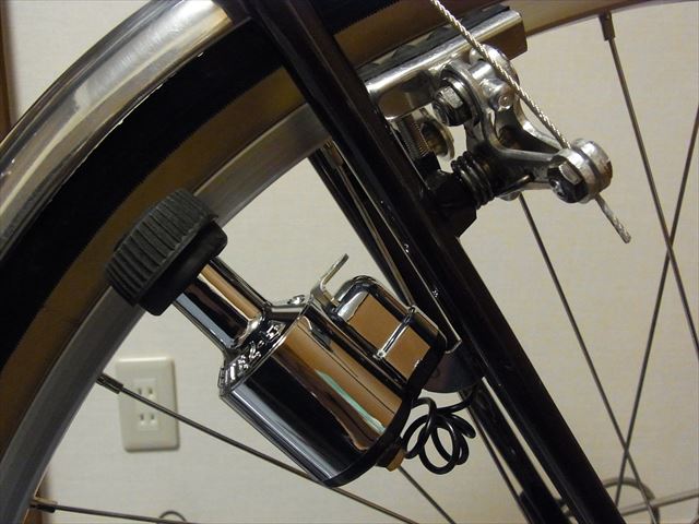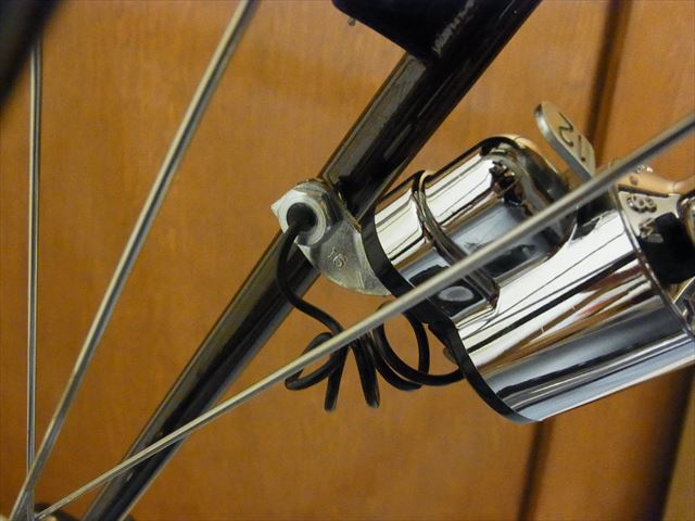 ランドナーにダイナモと工作した砲弾型ライトを取り付けてみました。 シートステーのダイナモを取り付けるナット穴 (6mm) にシフトワイヤーを差し込んでエンドの出口までワイヤーを通しました。 0.75sqのビニール電線をエンドまで通し、その後にチェーンステーに押し込みボトムブラケットシェルまで通し、ダウンチュ-ブの出口まで通線しました。 ダイナモは定番のフランス製ソービッツ12Nです。 ソービッツ12Nの取り付けです。 内側から穴付きボルトで締め込みました。 小さな砲弾型ライト(LED 3W)を取り付けて完成です。