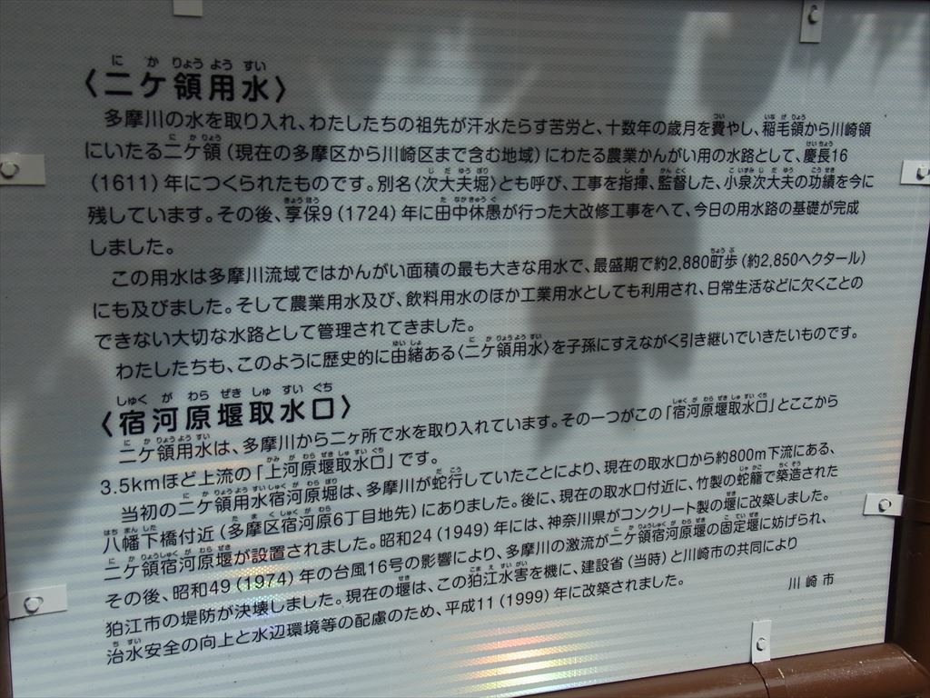 野川から多摩水道橋を渡り、二ヶ領せせらぎ館付近から用水路に到着しました。入り口付近に案内板が設置されています。