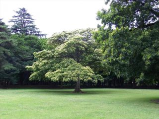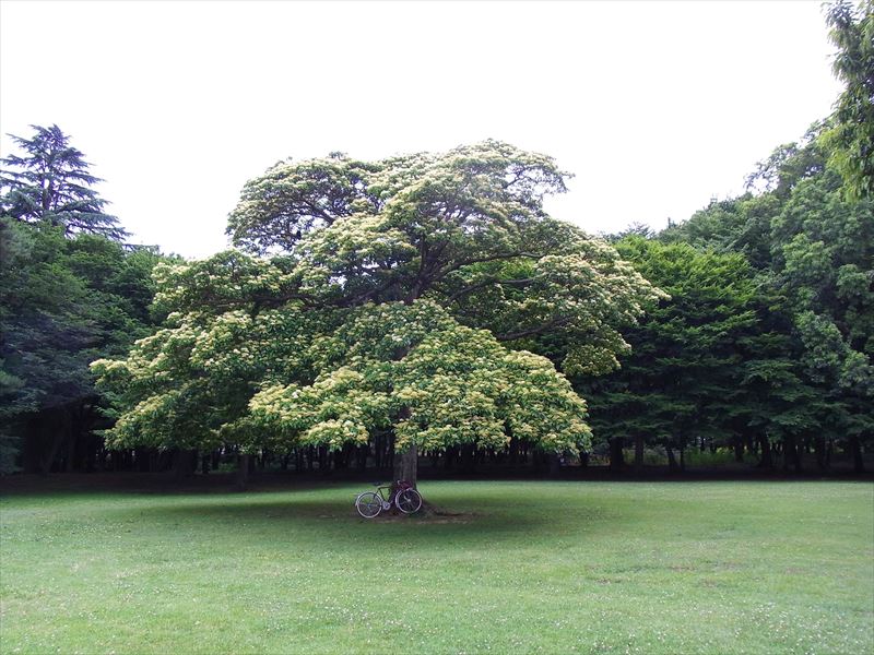 平日の閑散とした公園内、木々に囲まれた白い花をつけたクマノミズキが見頃です。