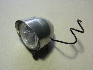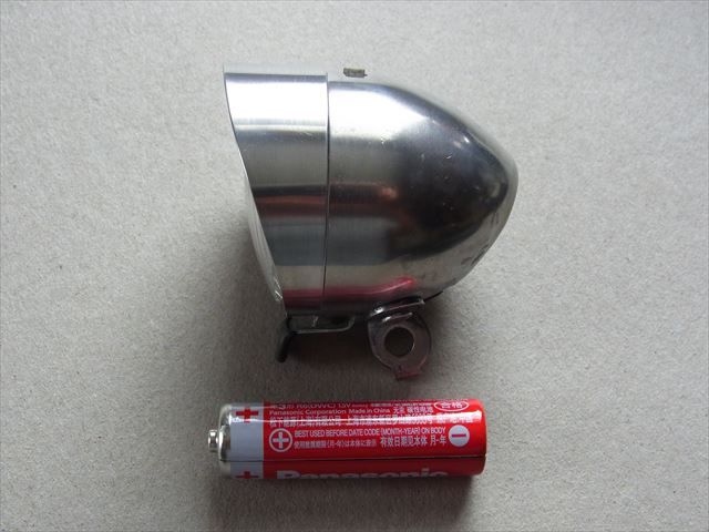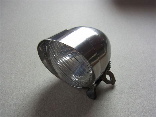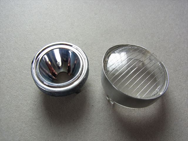 リフレクターとレンズカバーで「ツバ」は薄いアルミ板を加工し、アルマイトを剥がして研磨した砲弾型のライトです。