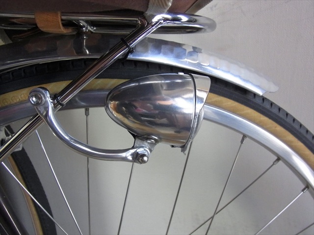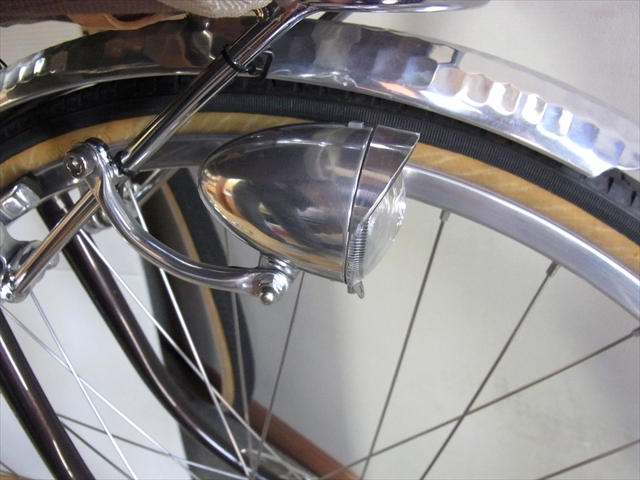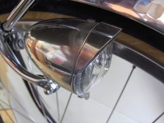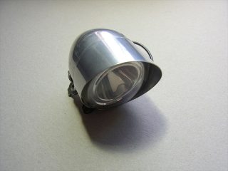 ランドナーにこのLEDライトを使っていましたが、プラスチックレンズが劣化してヒビが入ってしまったので、新しいレンズを加工して取り付け、内部のダイナモ用1W-LEDモジュール(時速15kmで中心光度約3500カンデラ、平均周辺光度約1500カンデラ)はそのまま使用しました。このライトも当分は使うことはありません。 昨年の10月に開かれた京王閣サイクルフリーマーケットで購入した古い砲弾型ライト(ミツバ?)を豆電球部分を改造して、内部にダイナモ用1W-LEDモジュール入れてみました。今はこのライトを取り付けています。