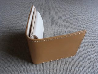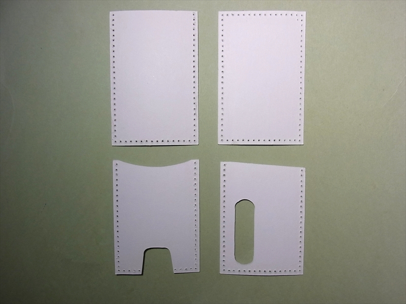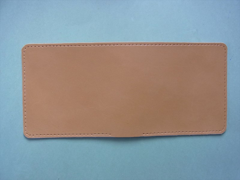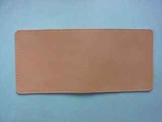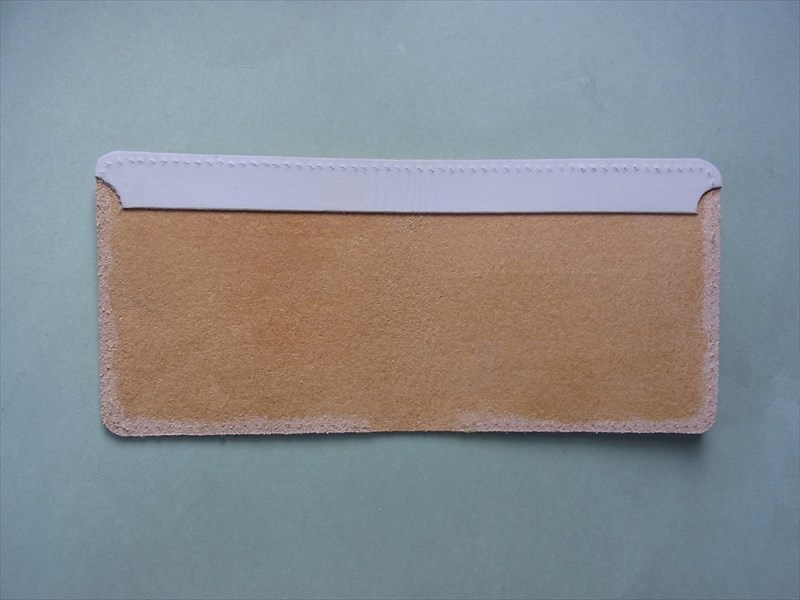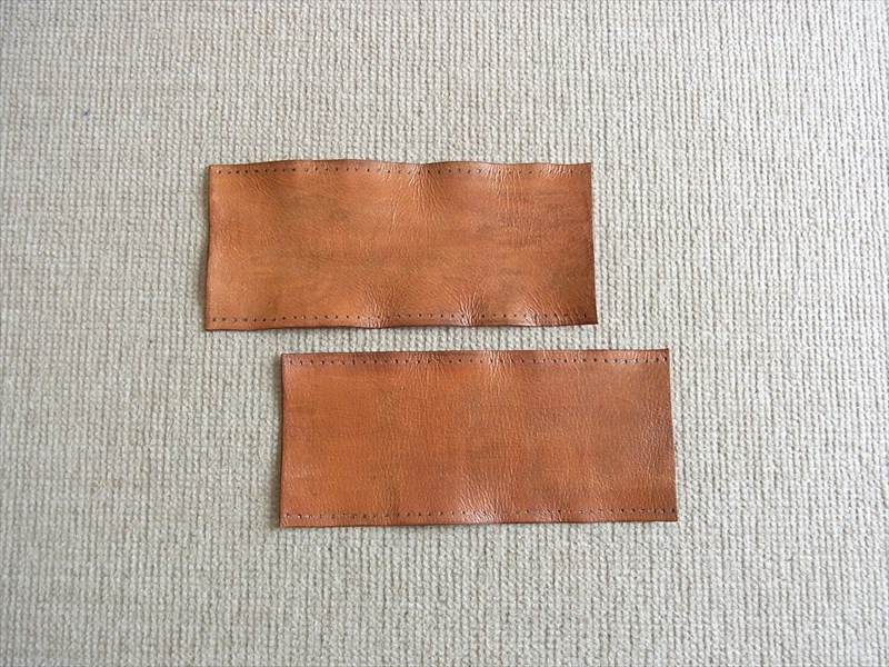 型紙にヌメ革(生成り)を重ねて、型紙のサイズ通りにカッターで2枚裁断します。